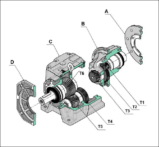 • C - цилиндрические передачи второй и третей передачи (T4, T5) заключенные в монолитный корпус редуктора